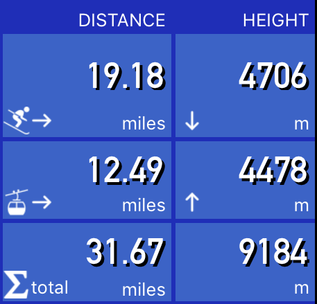 On historical tracks, the largest number displays the ‘difference’ between minimum and maximum, effectively the ski-height range that you have skied. In this case, the label will state ‘difference’ (as in the top image).
