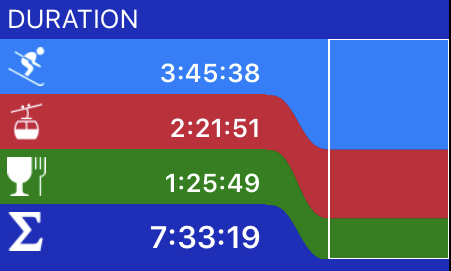 This little section gives you a breakdown of how you have spent your day. Time spent skiing, time in Lifts, and time spent just resting are all calculated. Total time for all activities is given also. This can help you maximise where you want to spend your time, be it skiing, or sitting in a restaurant. It also alows you to compare resorts based on ski-to-lift ratios.