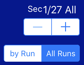 On the other hand, if the control button at the bottom is selecting ‘by Run’, then, the data presented on the whole page is restricted to reporting just the selected run. The run is then determined by the -/+ buttons. The run selected is then shown in the left hand panel (now coloured red). In this mode the Avg Slope panel shows the Average slope calculated for the selected run, in this case, run 9. The red colour is used to show you that the data on this page is now just showing data for a single run. Without this, it’s easy to get confused and to think that your data is not being updated live. (So, tip, if you see RED on this page, you know that the data is ONLY valid for the selected run.)