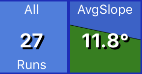 This double-section lets you know how many different activities SkiMax has determined you have performed during your day (here 27). A run can be either skiing, in or on a lift, or just simply resting. If the control button at the bottom is seleting ‘All Runs’ then the data reflects the total run-count. In this mode, the Avg Slope panel reports the average slope calculated from all SKI-runs. For this the lifts are not considered.